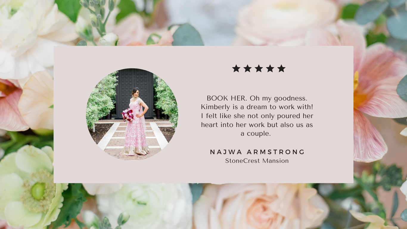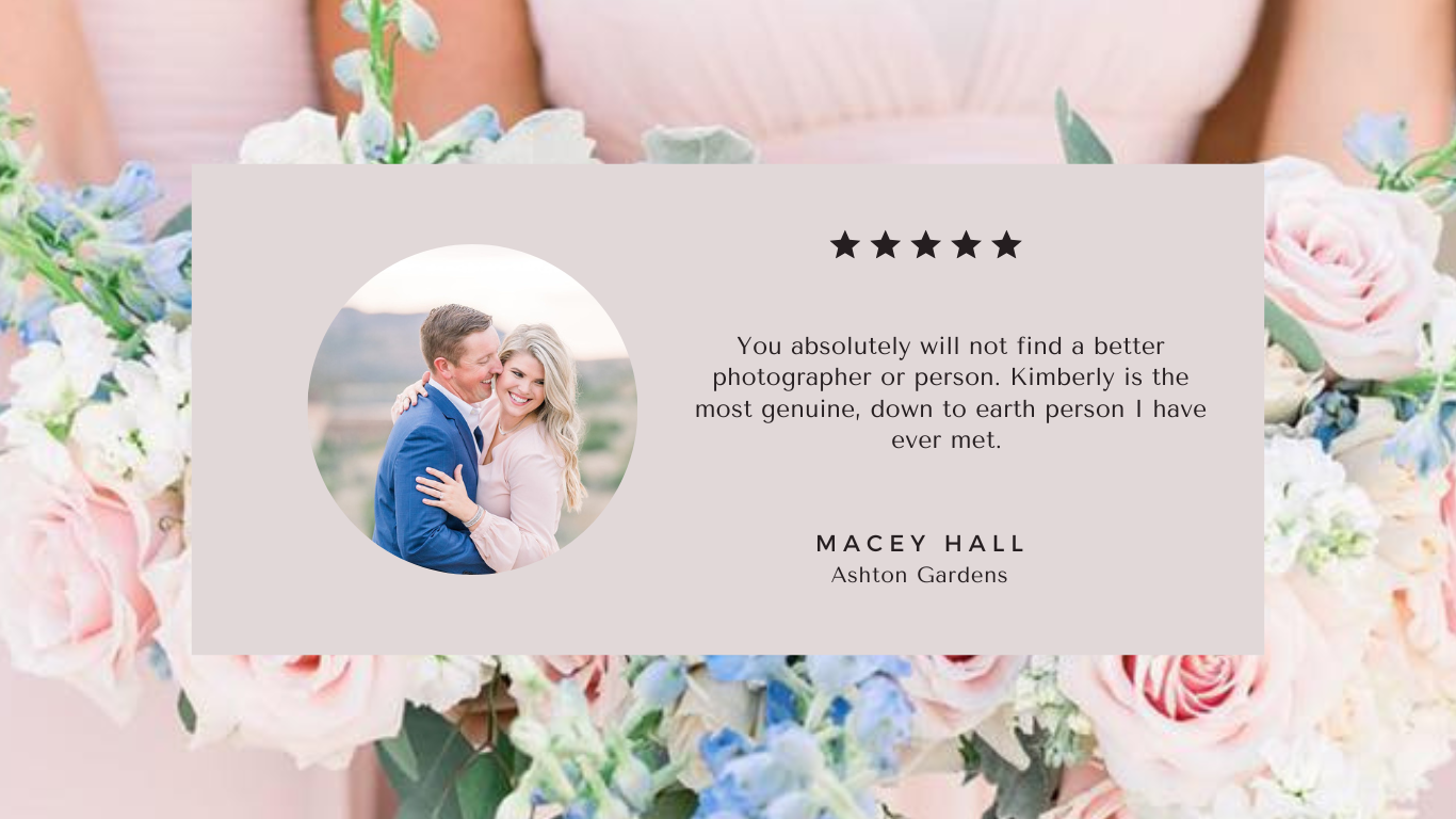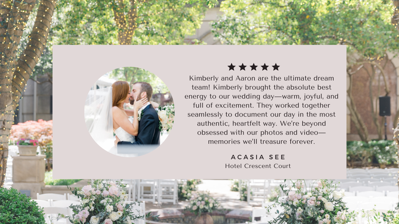 I'm Kimberly, a wedding photographer serving the Dallas Fort-Worth metroplex and Destinations worldwide. My style is light and airy with pops of color - I want your photos to feel as bright and joyful as you are without ever going out of style!