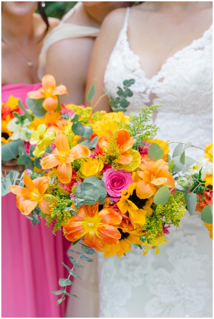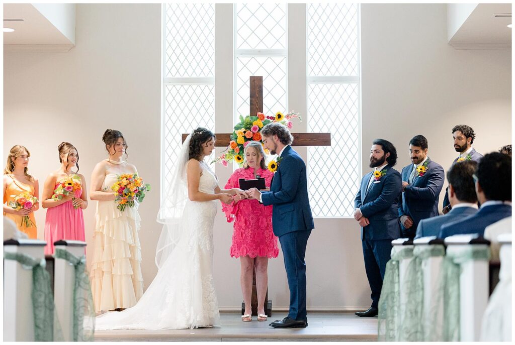 If I could describe Emmi and Max’s wedding in one word, it would be joyful! From the moment I arrived at Montclair Venue in Colleyville, TX, I knew this was going to be such a special day. The venue glowed in the summer light, and when you added in the pops of color from Funkytown Social Co’s florals… wow. It felt like stepping straight into a sunset! 🌅 Bold pinks, oranges, yellows, and purples danced across the bouquets, centerpieces, and ceremony backdrop—it was magic.
